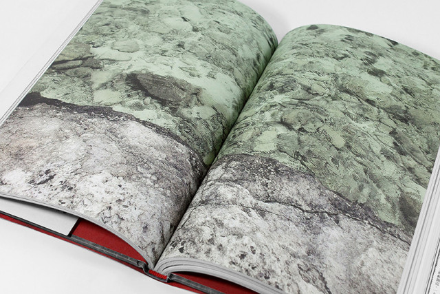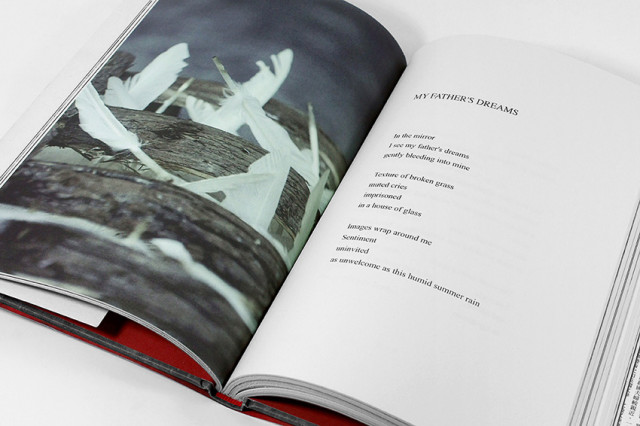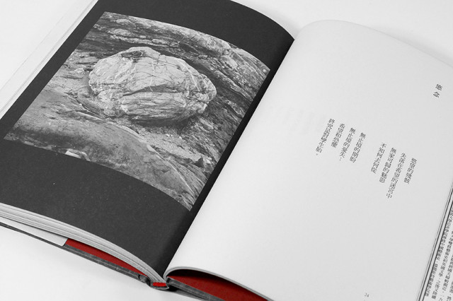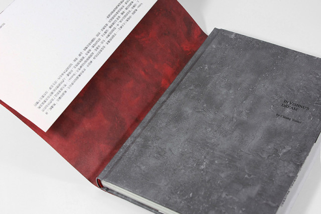 《浮生记行》英文书名《IN VISHNU’S DREAM》(毗湿奴的梦),在神话意义中代表了世界的生成;人世所经历的一切循环都源自于毗湿奴的沉睡与梦醒。 设计者将结霜的水珠/枯老的木(易消逝的媒介)转化为斑驳石块(不易消逝的媒介),来隐喻诗的诞生。书衣绢印红墨,作为翻开大红扉页前的引言。中文面以特色油墨印刷,在深灰色墨裡带一点点蓝,一点点红,一点点浮生的沧桑。英文面则以银墨处理,表现梦境的绚烂。精装内封将作者的画作局部放大铺成满版;书名烫雾黑,像是在石墙上的刻印。全封面充满图像,却没有具体的符号或形态,像是看到什么却又不真的看到什么,一如介於梦与现实之间的感官弥留。